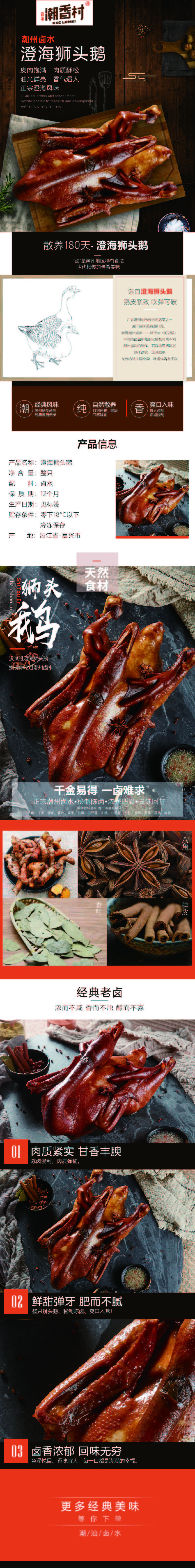 產品介紹:澄海獅頭鵝——眾多的鹵水食物里,地位最高的非鹵水鵝莫屬,俗語有講,「無鵝肉勿滂沛」,意思就是,沒有鵝肉的宴席又怎能算得上豐盛? 這就是潮州鹵水鵝的魅力,從肉到骨頭到鹵水,每一部分都充滿著溫潤而細膩的清香。 工藝:陳鹵鹵制 規格(g):整只 包裝規格:1只/袋 箱規:無