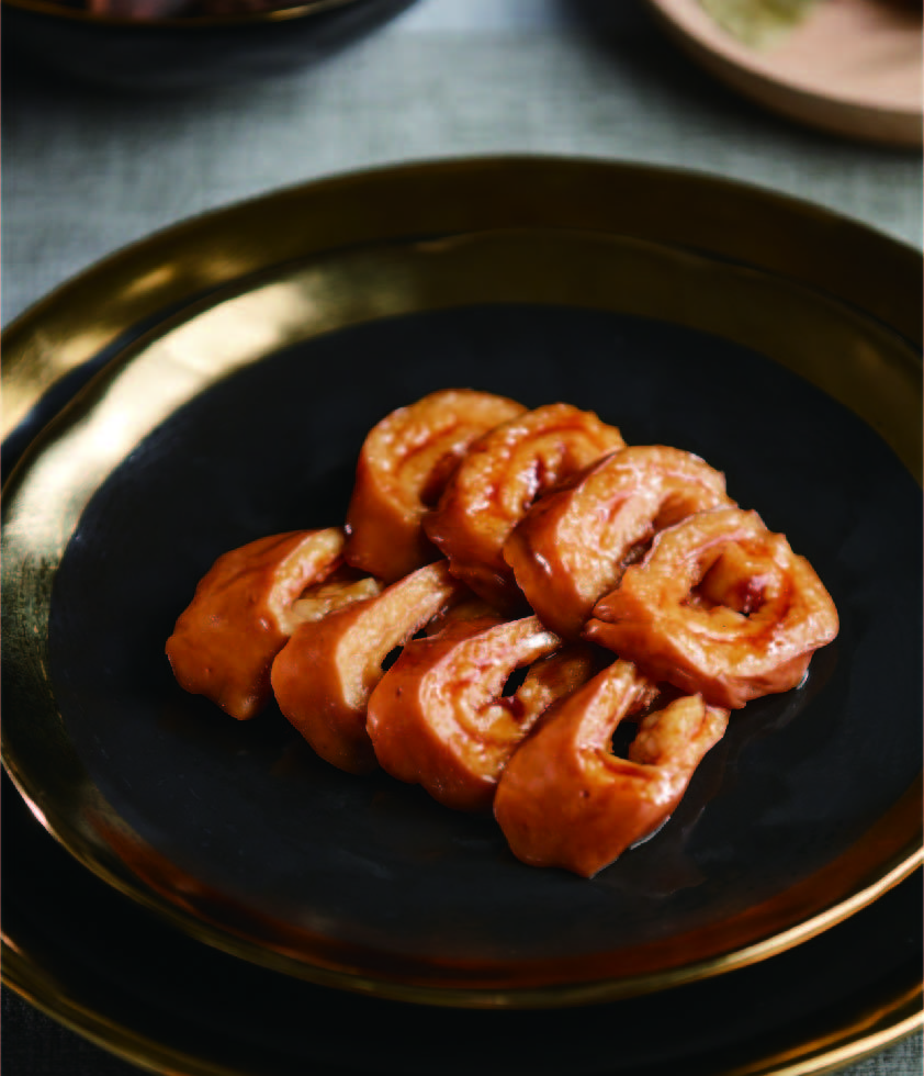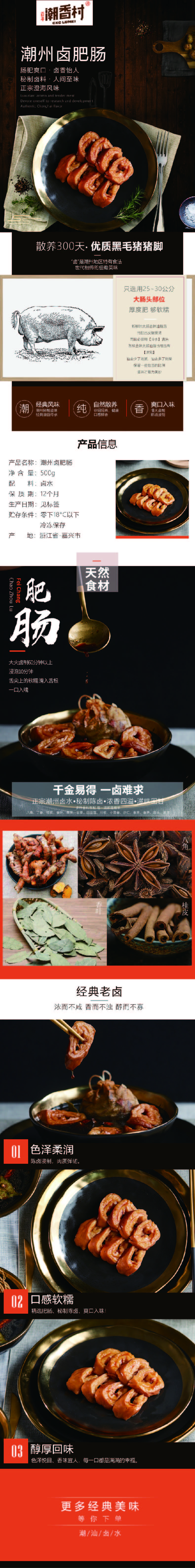 產(chǎn)品介紹:潮州鹵肥腸——九轉(zhuǎn)十八彎中的人間至味。潮香村只選用大腸頭部位置的25~30公分入料,因?yàn)樗穸确剩瑝蜍浥矗朔誓c爽口,鹵香味怡人! 工藝:陳鹵鹵制 規(guī)格(g):500g 包裝規(guī)格:500g/袋 箱規(guī):無