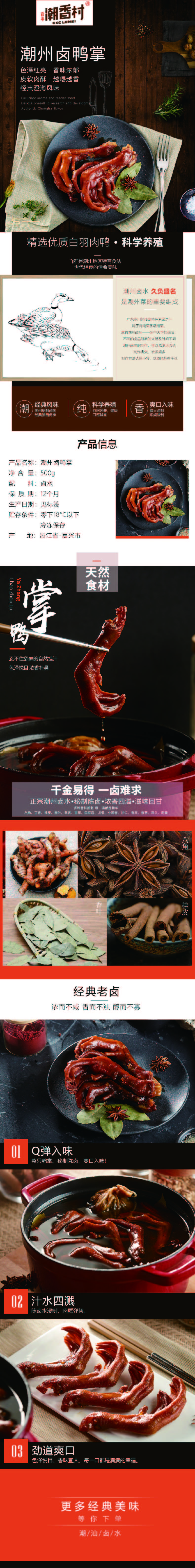 產(chǎn)品介紹:潮州鹵鴨掌——選用新鮮上好鴨掌,色澤紅亮,香味濃郁,皮軟肉酥,越嚼越香,百年經(jīng)典美味傳承,親友團(tuán)聚,佐酒小酌首選佳肴。 工藝:陳鹵鹵制 規(guī)格(g):500g 包裝規(guī)格:500g/袋 箱規(guī):無