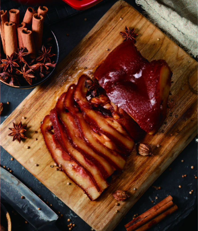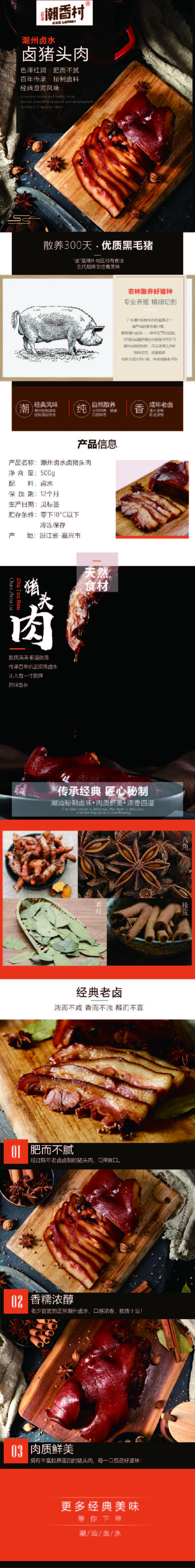 產品介紹:潮州鹵豬頭肉——經過陳年老鹵鹵制的豬頭肉,Q彈爽口,膠質滿滿,垂涎欲滴,傳承百年的正宗陳鹵水沁入每一寸肌理,回味悠長。